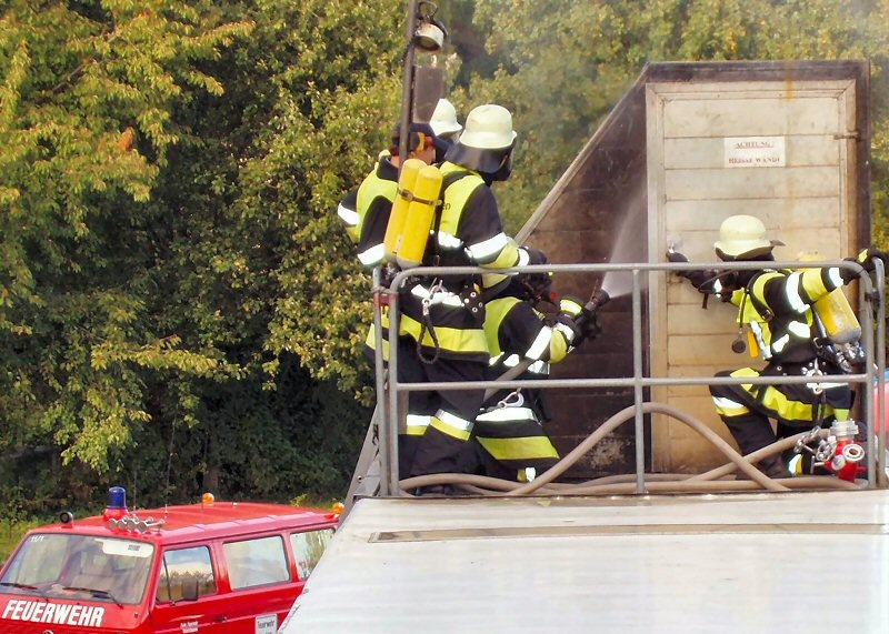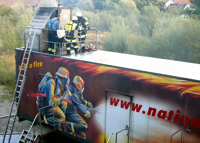 Am Wochenende hatten die Feuerwehren des Landkreises Dachau, die mit Atemschutzgeräten ausgerüstet sind, Gelegenheit, an einem Brandübungs-Container den Einsatz vor dem Ernstfall zu üben. Kreisbrandmeister Maximilian Kaltner und seinem Team war es gelungen, ein mobiles Brandhaus, das auf einem Lkw-Sattelauflieger aufgebaut ist, zu belegen und für drei Tage auf dem Gelände des Dachauer Feuerwehrhauses aufzustellen. In diesem mobilen Brandhaus, bestehend aus drei Brandräumen und fünf Brandstellen, konnte man unter realistischen Bedingungen und bei veränderten Raumsituationen, Geräuschsimulation, Videoaufzeichnung und externer Fernsehübertragung zur Darstellung verschiedener Wohnungs- und Industriebrandszenarien, nachvollziehen. Der Einstieg in das Brandhaus erfolgte über die Dachluke; die erste Brandstelle, die zu löschen war, befand sich unterhalb der Treppe mit kräftiger Durchzündung beim Öffnen der Dachluke – im Treppenhaus loderte eine weitere Brandstelle. Beim Öffnen der unteren Brandraumtür schlug der gefürchtete „Flash-Over“ bis in den Treppenhausbereich – im vernebelten Brandraum, in dem Eingangstemperaturen von ca. 250 bis 300 Grad herrschten, waren Gegenstände zu löschen. Unterhalb der Treppe kam es immer wieder zu Rückzündungen und zuletzt war in einem weiteren Raum eine Chemieanlage installiert, die ebenfalls in Brand geraten war und gelöscht werden musste. Die Anlage selbst, konnte entweder vollautomatisch, als auch manuell gesteuert werden. Bis einschließlich Sonntag durchliefen 243 Feuerwehrdienstleistende der Wehren der Stadt und des Landkreises die Anlage – das Ergebnis der Übung bewerteten die Teilnehmer, denen einiges an Energie abverlangt wurde, überaus positiv. Für den Ernstfall stand an allen Tagen ein Team des BRK Dachau samt Rettungswagen an Ort und Stelle in Bereitschaft.
