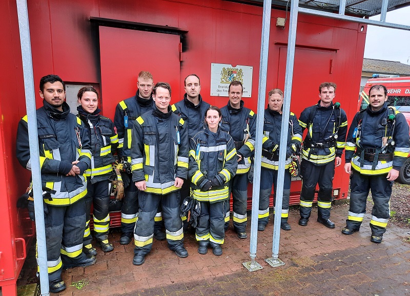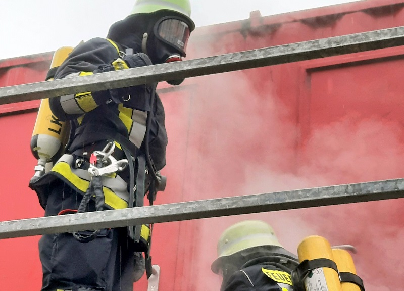 Als Angriffstrupp mussten die Teilnehmer ihre Orientierung und Arbeitsweise zudem bei „Nullsicht“ unter Beweis stellen und sich zum Abschluss einer Prüfung unterziehen. Entsprechend der Einsatzlagen hatten sie ihre mit Wasser gefüllten Schläuche bei Bränden im Gebäude richtig zu verlegen und unterschiedlich angeordnete Räume nach Brandherden und Personen abzusuchen.