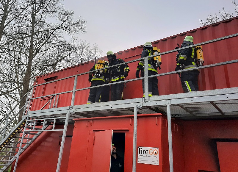 Nach der bereits erfolgreich absolvierten praktischen und theoretischen Prüfung fuhren die Teilnehmer zum Abschluss des Kurses nach Karlshuld, um in der gasbefeuerten Brandsimulationsanlage des Freistaats Bayern das richtige Vorgehen in Brandräumen sowie die Möglichkeiten der Brandbekämpfung unter realitätsnahen Bedingungen noch weiter zu vertiefen.