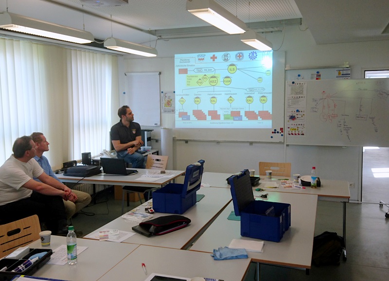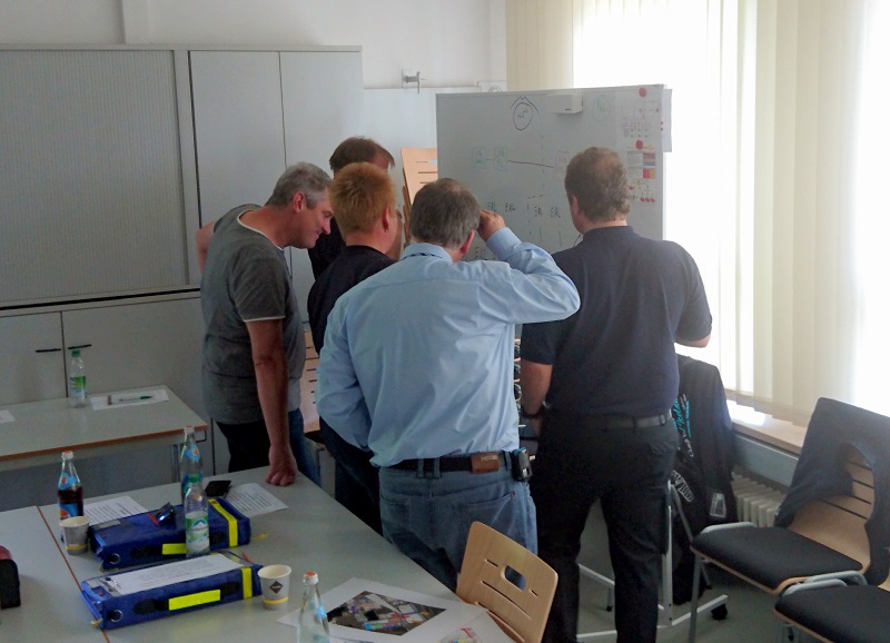 Danach wurden die insgesamt 14 Teilnehmer der Hilfsorganisationen gruppenweise eingeteilt, um die Kommunikationsstrukturen von Großschadenslagen anhand von mehreren Einsatzbeispielen zu planen. Die Ergebnisse wurden anschließend in der gesamten Runde diskutiert.