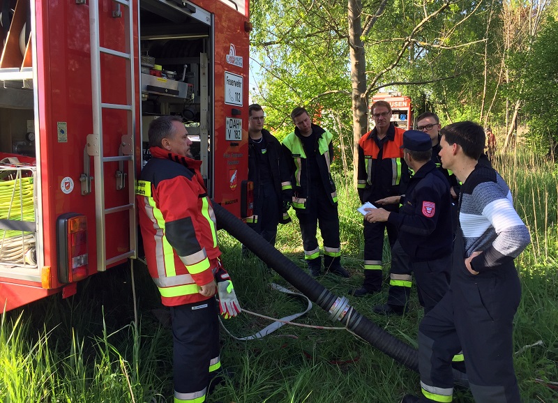 v Zum Abschluss wurde an der Glonn in Markt Indersdorf die Wasserentnahme aus offenen Gewässern sowie die anschließende Wasserförderung über eine 1.000 Meter lange Schlauchstrecke geübt.