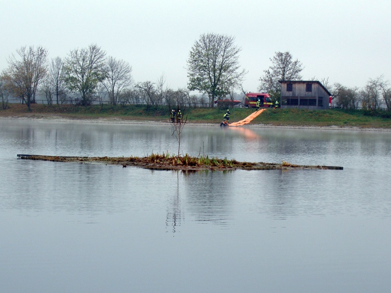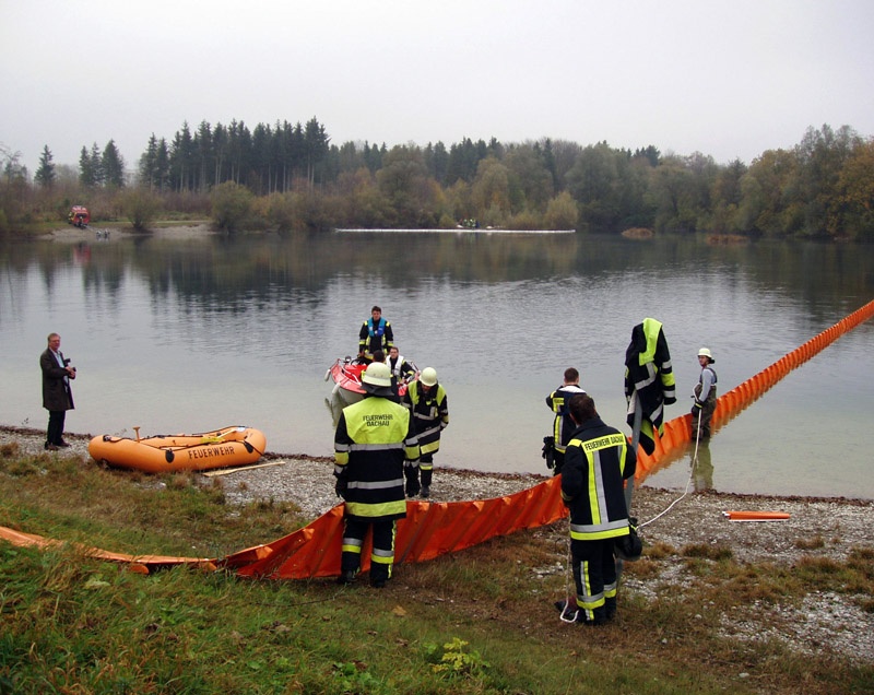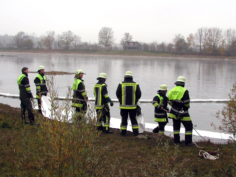 "Fahrzeug im See, verliert Öl" so lautete am 26.10.08 um 11 Uhr das Einsatzstichwort für die Feuerwehr Dachau. Beim Eintreffen der ersten Kräfte am Landschaftssee in Dachau Süd, fanden sie ein Dreirad im See und einen massiven Ölfilm auf dem Wasser.Umgehend wurden weitere Kräfte zur Unterstützung alarmiert. Die Floriansjünger bauten mehrere Ölsperren im See ein und legten Vliestücher und saugfähige Schwimmwürfel aus, um das Öl zu binden. Ursache des Ölfilms war vermutlich eine mutwillige Umweltverschmutzung.
