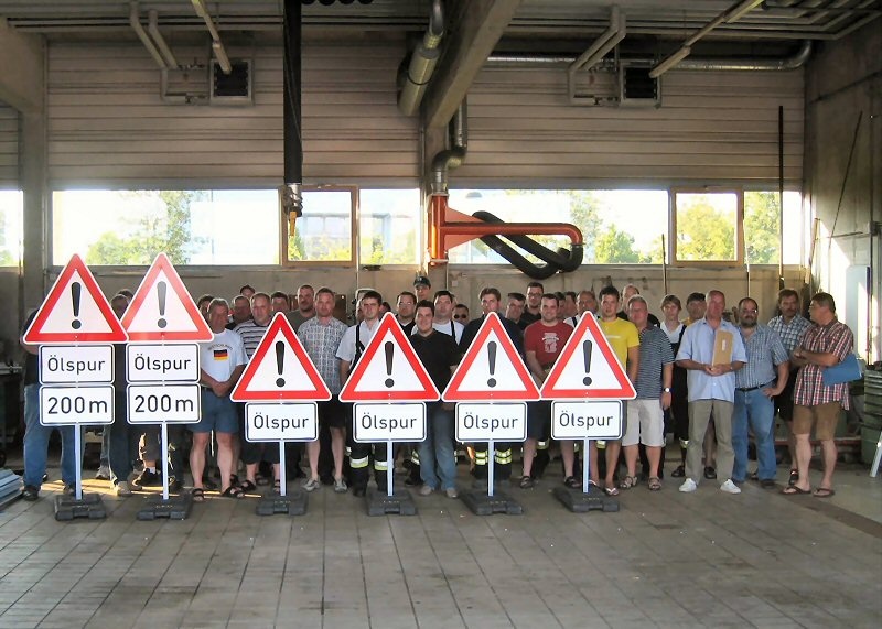 In den letzten Jahren gab es immer wieder rechtliche Probleme im Hinblick auf die Beseitigung von Ölspuren, bzw. wie die Beschilderung nach einem derartigen Einsatz für die Feuerwehren zu erfolgen hat. In einem Gespräch zwischen der Polizei, den Bauhöfen, der Bürgermeister sowie der Kreisbrandinspektion wurde dies nun geklärt. Bei der Besprechung wurde festgestellt, dass die Schilder nicht gemäß der Straßenverkehrsordnung (StVO) aufgestellt wurden und die bisher bei den Feuerwehren vorhandenen Gefahrenschilder nicht mehr verwendet werden dürfen. Das Landratsamt Dachau hat nun als zuständige Straßenverkehrsbehörde gemäß den entsprechenden Paragraphen der StVO im Einvernehmen mit der Polizeiinspektion Dachau, dem Landkreis Dachau und dem Straßenbauamt München als Straßenlastträger eine verkehrsrechtliche Anordnung erlassen – hier wurde nun genau geregelt, wie bei Ölspuren auf der Fahrbahn die betroffenen Straßenbereiche zu beschildern sind. Jede Gemeinde, bzw. Stützpunktfeuerwehr hat nun einen Satz der gültigen Gefahrenschilder als so genannte Erstausstattung erhalten. Die Kommandanten und deren Stellvertreter wurden vom Leiter des Kreisbauhofes, Thomas Singer und von Kreisbrandinspektor Heini Schmalenberg dementsprechend geschult. Die Kosten für die neuen Schilder, die allen Feuerwehren nun zur Verfügung stehen, wurden je zu einem Drittel von den Gemeinden, dem Landkreis und dem Staat übernommen; bei weiteren Beschaffungen von Schildern ist jedoch eine Kostenteilung nicht mehr möglich.