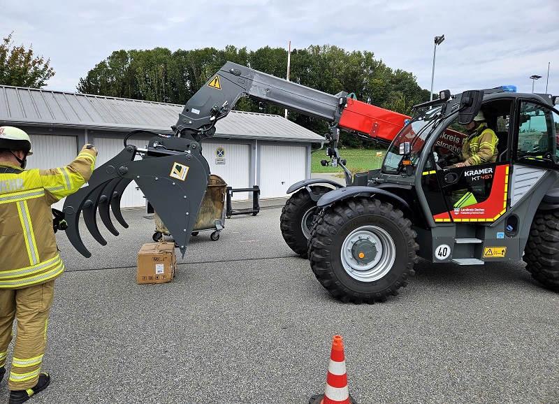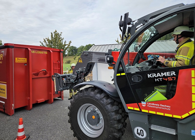 Den Umgang mit den Gerätschaften des Katastrophenschutzzentrums übten am vergangenen Samstag (07.10.2023) acht erfahrene Maschinisten. Der Fokus der Ausbildung lag dabei auf der ordnungsgemäßen Handhabung der verschiedenen Anbaugeräte für den Kran des Wechsellader-fahrzeugs sowie den Teleskoplader des Landkreises Dachau.
