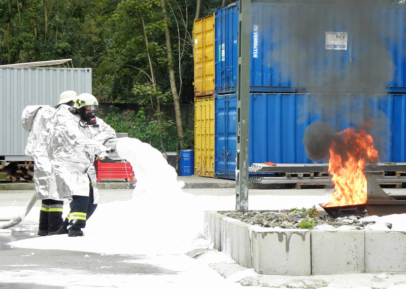 Die Brandbekämpfung wurde dabei durch die umher gelagerten Gefahrstoffe erschwert, die zudem bestimmt werden mussten. Die restlichen Kameraden haben derweil einen „Dekontaminationsplatz“ errichtet, um die mit Schadstoffen verschmutzten Kameraden zu reinigen.