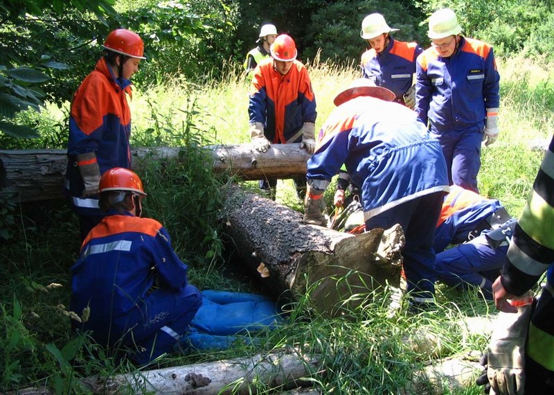 Um die Feuerwehranwärter auf den nächsten Einsatz vorzubereiten, gab es einen Theorieunterricht zum Thema Forstunfälle. Jedoch wussten die Jugendlichen nicht, dass es anschließend einen Einsatz passend zum Thema gab. Mit dem Alarmstichwort "Forstunfall: Person unter mehreren Bäumen eingeklemmt" rückten alle Feuerwehranwärter aus um den Verunglückten mit Motorsägen und Hebekissen zu retten. Nach dem Wiedereinrücken im Gerätehaus galt es zuerst die Fahrzeuge zu bestücken und das Gerätehaus auf Vordermann zu bringen, ehe alle ihre wohlverdiente Pause mit Eisessen und Swimmingpool hatten.