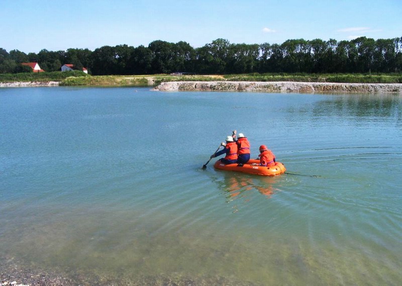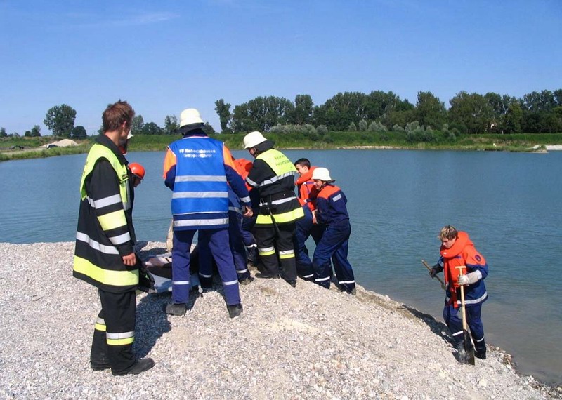 Das nächste Ereignis führte die Gruppe gegen 17 Uhr an den Kiesweiher in Ampermoching, wo es zwei Personen mit Hilfe eines Schlauchbootes aus dem Wasser zu retten galt.