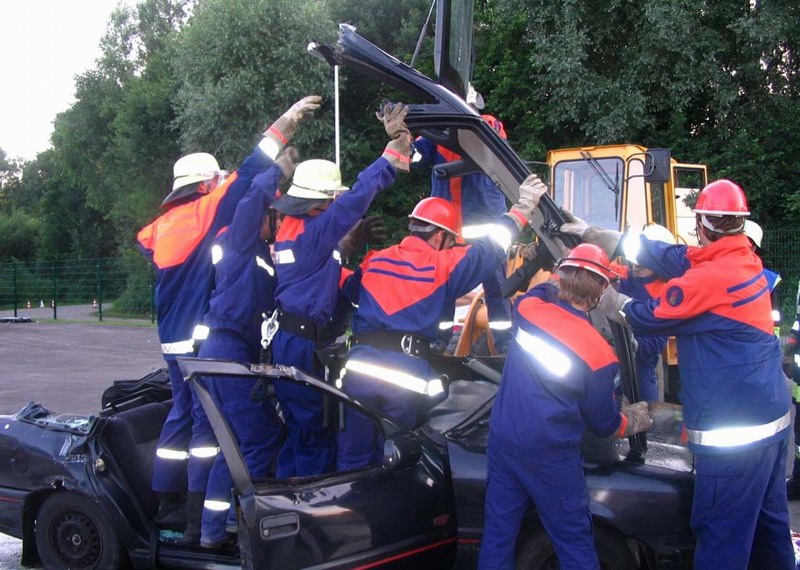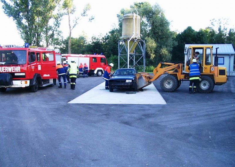 Bei der Ankunft am Unfallort stellte sich heraus, dass ein Radlader in die Fahrerseite des mit vier Personen besetzen Autos geprallt war. Fahrerin und Beifahrerin waren schwer verletzt eingeklemmt, die beiden Kinder auf dem Rücksitz glücklicherweise nicht. So galt es zuerst die Kinder im Fond des Fahrzeugs zu retten.