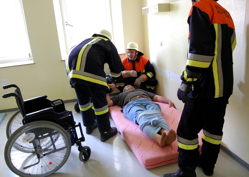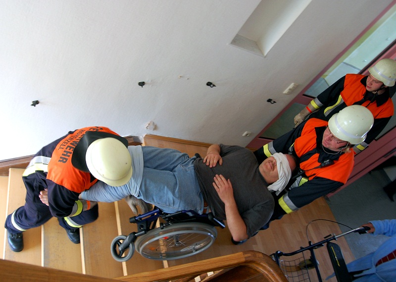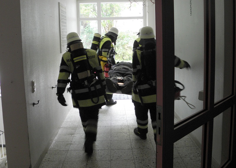 Auch die nicht verrauchten Wohnbereiche musste durch die Feuerwehrkräfte geräumt werden. Die Herausforderung lag hierbei im Umgang mit älteren und behinderten Menschen, die teils auch in Rollstühlen ins Freie gebracht werden mussten.