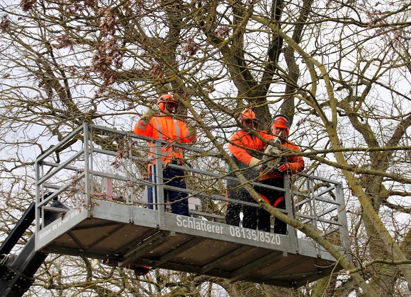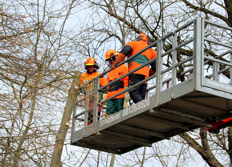 Im Anschluss ging es in ein Waldstück nahe Unterweilbach, wo verschiedene Arbeits- und Schnitttechniken an Ästen und Kronenteilen sowie das Absetzen von Ästen unterschiedlicher Stärke praktisch beübt wurden. Die Ausbildung fand dabei realitätsnah in einem Arbeitskorb statt, der die Übungseinheiten in einer Höhe von bis zu 18 Metern ermöglichte.