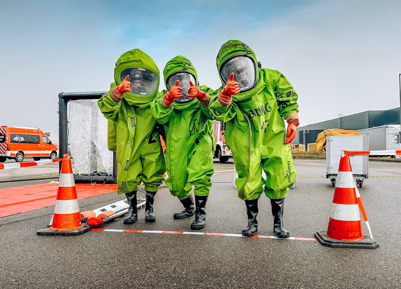In der Praxis konnten die Lehrgangsteilnehmer ihr Wissen in mehreren realitätsnahen Stationen anwenden. Ein Schwerpunkt lag auf dem sicheren Umgang mit Pumpen, der Auswahl und Anwendung verschiedener Abdichtmöglichkeiten sowie dem fachgerechten Erden von Fahrzeugen und Gerätschaften, um Zündquellen bei Gefahrstofflagen zu vermeiden. Ebenso intensiv geübt wurde der Aufbau von Dekontaminationsstellen: Zunächst wurde die Sofort-Dekontamination mit dem ersteintreffenden Fahrzeug durchgespielt, bevor die Teilnehmer den Ausbau zu einem vollständigen Standard-Dekonplatz vornahmen. Ergänzend dazu wurde in der Theorie erläutert, wie ein voll ausgebauter Dekonplatz mit einem Dekontaminationsfahrzeug aufgebaut ist und betrieben wird.