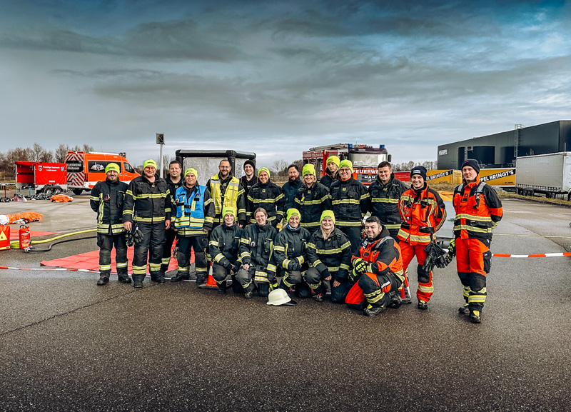 Den Höhepunkt des Kurses bildete die Abschlussübung, die am Samstag in einem Betrieb im Gewerbegebiet Odelzhausen stattfand. Das Szenario war realitätsnah gestaltet und verlangte den Teilnehmern das volle Spektrum ihres erlernten Wissens ab. Zunächst galt es, eine korrekte Ersterkundung durchzuführen und relevante Informationen zur Lage sowie zum möglichen Gefahrstoff einzuholen. Anschließend mussten die Teilnehmer eine Personenrettung unter ABC-Bedingungen durchführen und eine Leckage fachgerecht abdichten. Ein weiterer Schwerpunkt der Übung lag auf der Dekontamination – sowohl der eingesetzten Kräfte als auch einer liegenden, verletzten Person, was besondere Sorgfalt und strukturierte Abläufe erforderte.
