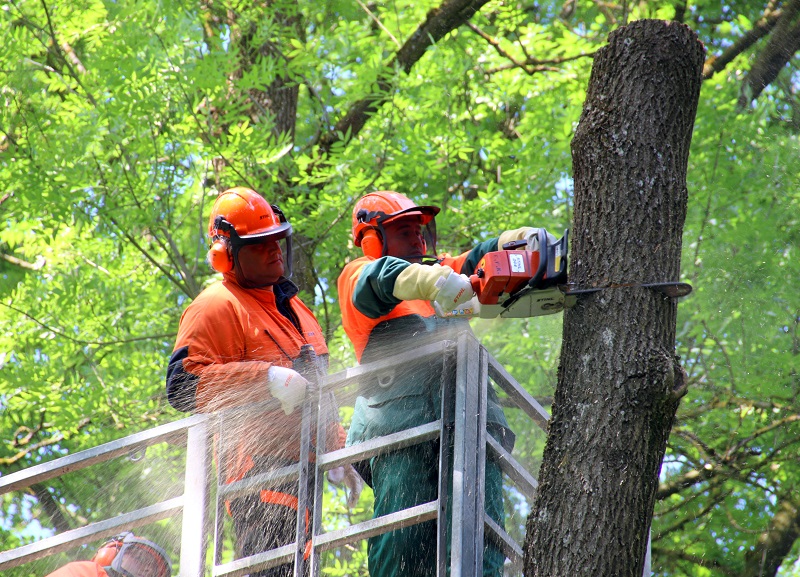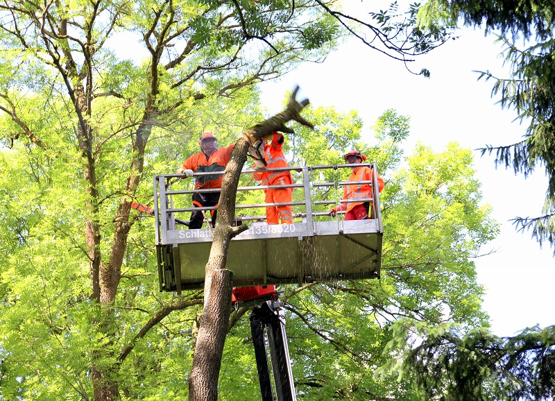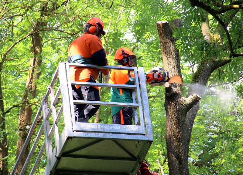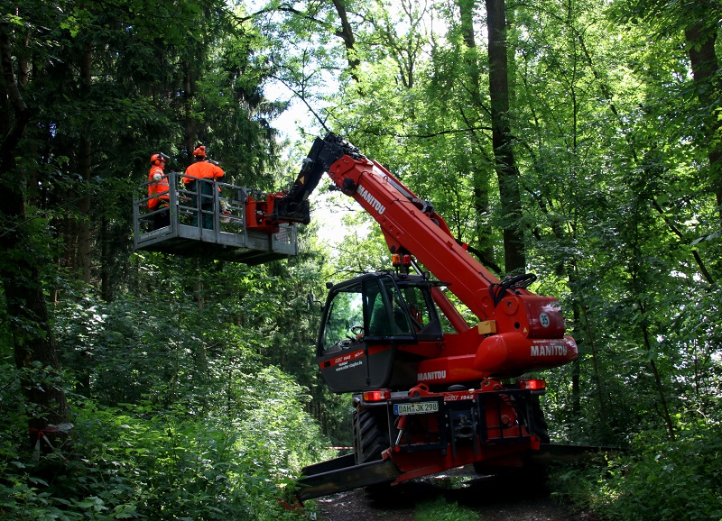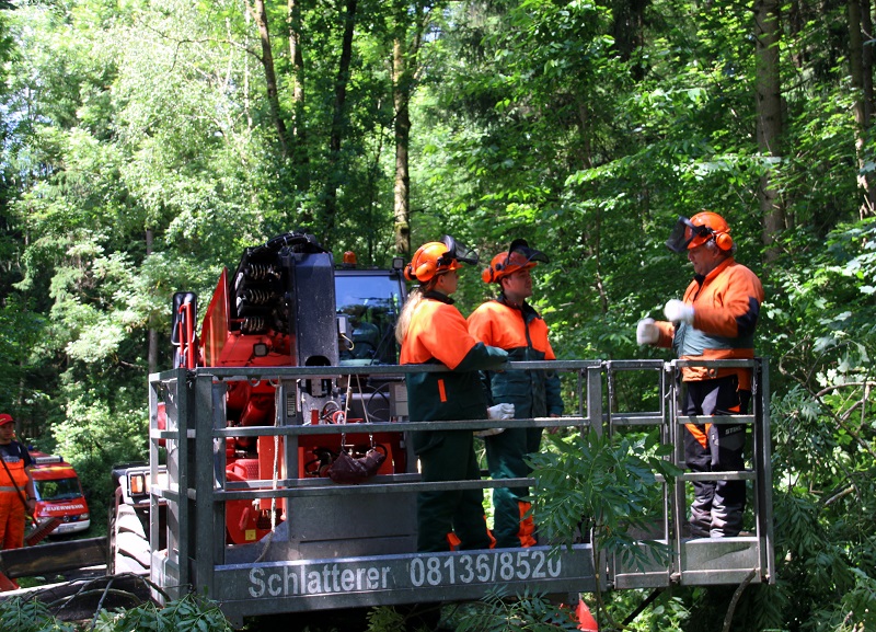 Im Anschluss ging es in ein Waldstück nahe Unterweilbach, wo verschiedene Arbeits- und Schnitttechniken an Ästen und Kronenteilen sowie das Absetzen von Ästen unterschiedlicher Stärke praktisch beübt wurden. Die Ausbildung fand dabei realitätsnah in einem Arbeitskorb statt, der die Übungseinheiten in einer Höhe von bis zu 18 Metern ermöglichte.