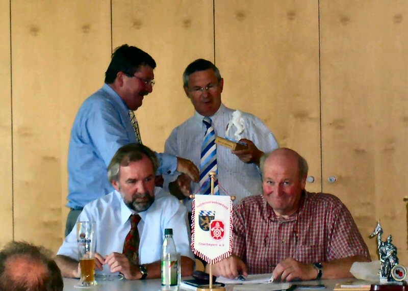 Nach dreistündiger Tagung, bei der es u.a. um Berichte der Regierung, Förderrichtlinien und Fachbereichsarbeit ging, erhielten Stadtbrandinspektor Tonhauser und der Vorsitzende des Kreisfeuerwehrverbandes Dachau, Kreisbrandrat Rudi Reimoser, ebenfalls ein Präsent vom Vorsitzenden für die Ausrichtung der Sitzung überreicht.