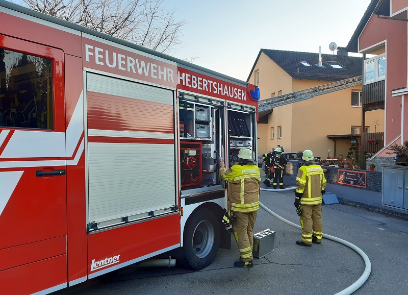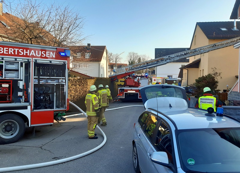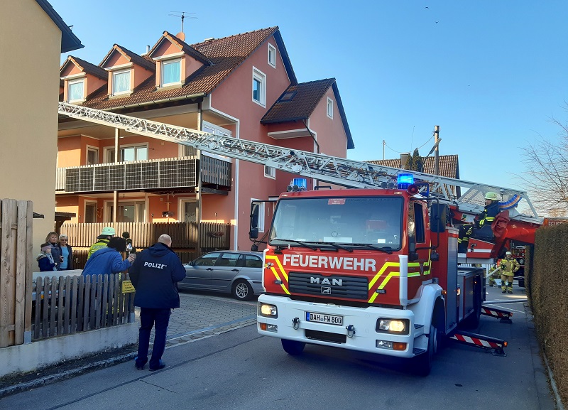 Zu einem Balkonbrand in Hebertshausen wurden am Donnerstagnachmittag (09.02.2023) um 15.04 Uhr Feuerwehr und Rettungsdienst alarmiert. Beim Eintreffen der ersten Einsatzkräfte konnte ein Entstehungsbrand auf dem Balkon lokalisiert werden, das Feuer begann bereits auf den Dachstuhl überzugreifen. Personen befanden sich glücklicherweise nicht mehr in dem Gebäude.