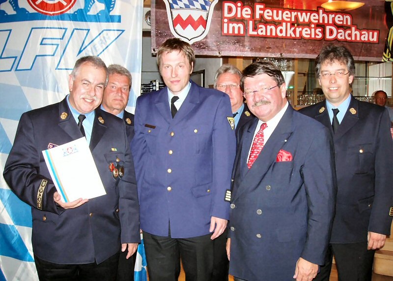 Beim Ehrenabend des Landkreises und der Kreisbrandinspektion Dachau im Saal der Gaststätte Doll in Ried wurde Kreisbrandrat Rudi Reimoser, der völlig überrascht war, eine seltene und hohe Ehrung zuteil. In Würdigung und Anerkennung seiner hervorragenden Leistungen im Feuerwehrwesen zeichnete der stellvertretende Vorsitzende des Bezirksfeuerwehrverbandes Oberbayern und zugleich Chef der Berufsfeuerwehr München, Ltd. Branddirektor Wolfgang Schäuble, Reimoser mit dem Bayerischen Feuerwehr-Ehrenkreuz in Gold des Landesfeuerwehrverbandes Bayern aus.In einer humorvoll gehaltenen Laudatio ließ Schäuble den Werdegang Reimosers im Feuerwehrwesen Revue passieren. Angefangen vom Eintritt in jungen Jahren in die Dachauer Feuerwehr, bis zu seinen Ernennungen zum Zugführer, Kreisbrandmeister, Kreisbrandinspektor und schließlich zur Wahl zum Kreisbrandrat.