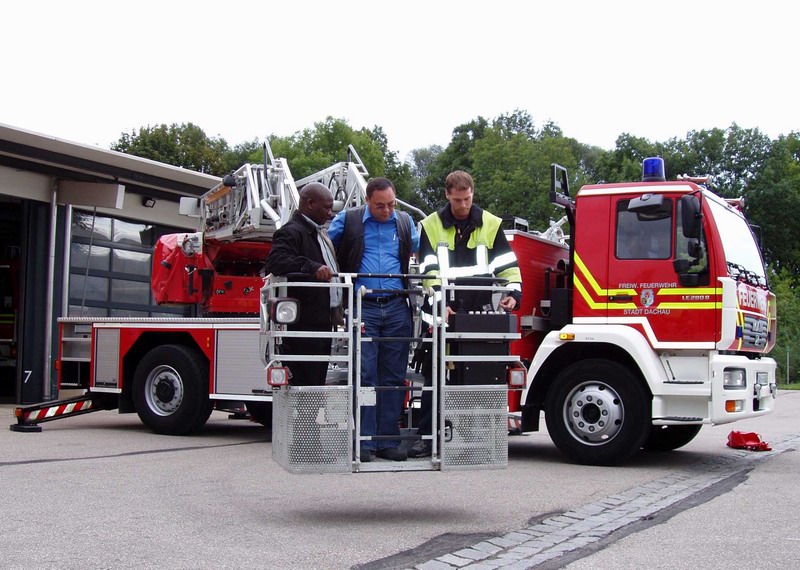 Eine Führung durch das Feuerwehrhaus und die Besichtigung des Fahrzeugs- und Geräteparks, sowie eine Fahrt mit der Drehleiter in luftige Höhen mit Blick auf die Dachauer Altstadt weckten bei den Gästen besonderes Interesse.