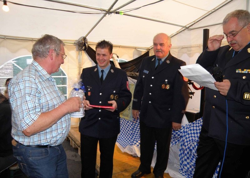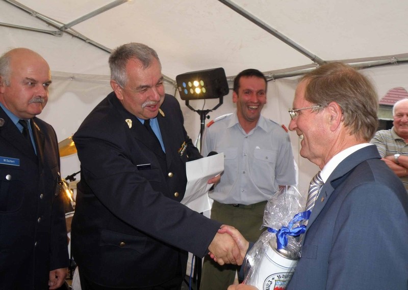 Nach einer kurzen Rede des Kreisbrandrats konnten drei Krüge des Landkreises Dachau an Bürgermeister Erich Fangl, Brandrat Johann Bertel und Löschmeister Josef Wöhrer übergeben werden. Bürgermeister Fangl revanchierte sich mit einem Weinkrug, Gläsern und der dazu gehörigen Flüssigkeit.