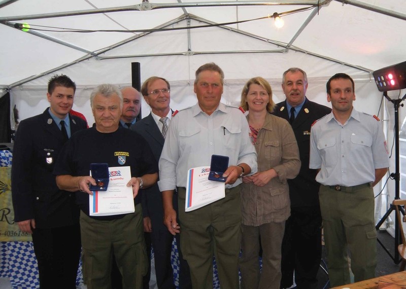 Für ihre Verdienste um die jahrelange Partnerschaft beider Feuerwehren erhielten Löschmeister Rudolf Freyhammer und Hauptlöschmeister Franz Wöhrer die Ehrenmedaille des Landesfeuerwehrverbandes Bayern.