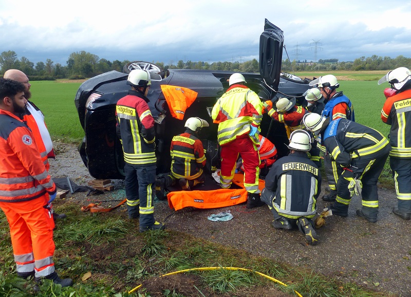 Die parallel eintreffenden Kräfte der Feuerwehr Feldgeding bereiteten die technische Rettung vor. Dabei wurde das Dach auf der Fahrerseite mit hydraulischem Rettungsgerät abgetrennt und nach unten geklappt, so dass die Rettungskräfte ausreichend Zugang zur Patientin bekamen. Anschließend wurde diese mittels einem Rettungsbrett aus dem Auto gehoben.