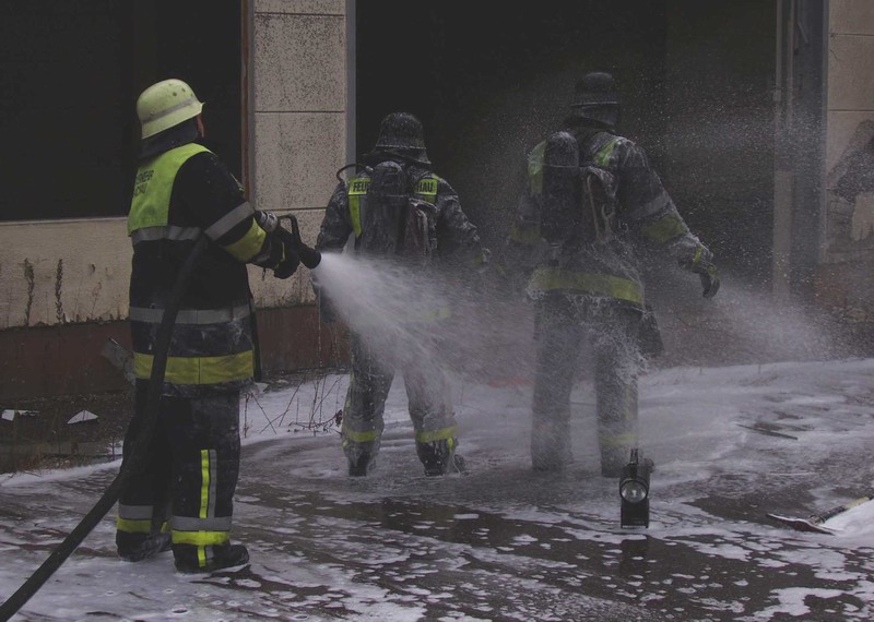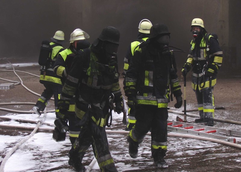 Die massive Rauch- und Hitzeentwicklung behinderten die vorgehenden Atemschutztrupps erheblich. Die Sicht betrug keine 10 Zentimeter. Die Sichtfenster der Schutzmasken waren nach wenigen Sekunden mit einer schwarzen Rußschicht überzogen und so mussten die Einsatzkräfte quasi blind den Brandherd suchen.