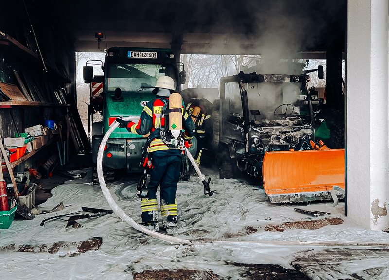Am heutigen Freitagmorgen (27.12.2024) wurde die Feuerwehr um 8.49 Uhr zu einem Brand im Bauhof Schwabhausen alarmiert, welcher sich in direkter Nachbarschaft zum örtlichen Feuerwehrgerätehaus befindet. Anrufer meldeten der Integrierten Leitstelle eine deutliche Rauchentwicklung aus der Betriebshalle.Zwei Trupps der Feuerwehr Schwabhausen gingen umgehend nach dem Eintreffen unter Atemschutz zur Brandbekämpfung in die Halle vor. Dort wurde schnell ein Schneeräumfahrzeug als Brandursache ausgemacht. Dank dem schnellen Eingreifen konnte das Feuer zügig unter Kontrolle gebracht und gelöscht werden, nach einer guten halben Stunde konnte „Feuer aus“ gemeldet werden.