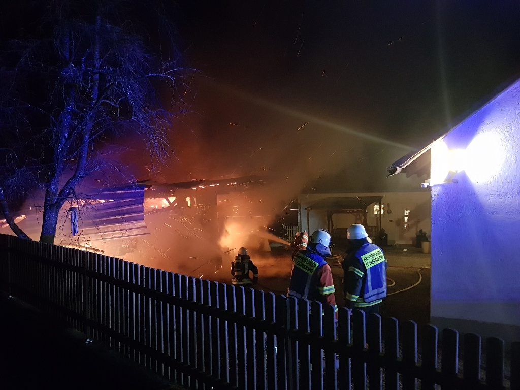 In Unterbachern (Gemeinde Bergkirchen) geriet aus bislang unbekannter Urschache ein Schuppen mit Anhängern, Brennholz und kleinen Strohvorräten in Brand. Eigene Löschversuche der Eigentümer konnten nicht verhindern, dass der Gebäudeteil mit den Anhängern beim Eintreffen der Feuerwehr bereits in Vollbrand stand. Ein Übergreifen auf das Wohngebäude und weitere angrenzende Gebäude konnte durch den Angriff mit drei Trupps unter Atemschutz und drei Löschrohren verhindert werden.