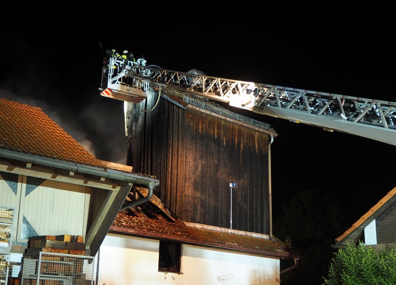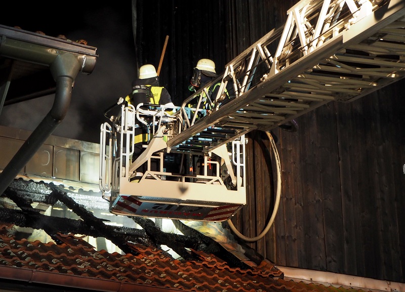 Beim Eintreffen der ersten Kräfte stand ein Teil des Dachstuhls des Schreinereibetriebs in Brand, offene Flammen waren sichtbar. Mit mehreren Löschrohren sowie dem Wenderohr der Indersdorfer Drehleiter konnte das Feuer schnell unter Kontrolle gebracht und ein Übergreifen auf benachbarte Gebäude verhindert werden.