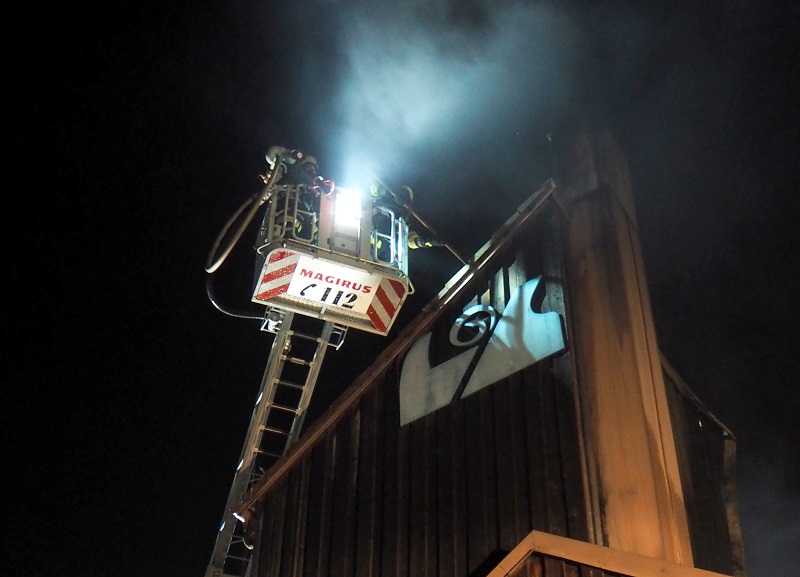Langwierig gestalteten sich die Arbeiten am angrenzenden Spänebunker des Betriebs. Da dieser auch der Wärmestrahlung ausgesetzt war und Teile der Bedachung vom Feuer in Mitleidenschaft gezogen wurden, musste überprüft werden ob sich die Holzspäne im Inneren ebenfalls entzündet haben. Dazu wurden Öffnungen geschaffen und die Temperatur im Silo mittels einer Sonde gemessen.