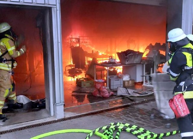 Bereits auf der Anfahrt war für die anrückenden Kräfte eine Rauchsäule sichtbar, vor Ort stand das Inventar der Betriebshalle in Flammen. Mehrere Trupps unter schwerem Atemschutz drangen umgehend in die Räumlichkeiten vor und haben mit den Löschmaßnahmen begonnen. Mehrere Wäschewägen und Kleiderständer wurden dabei zum Ablöschen ins Freie gebracht.