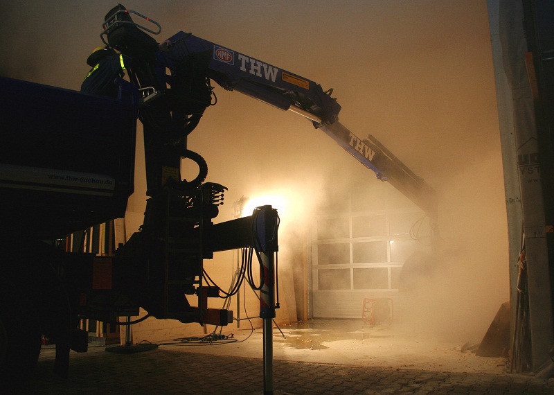 Deshalb entscheid man sich das Technische Hilfswerk anzufordern, um mittels der Baggerschaufel des Krans die kokelnden Hackschnitzel durch den Befüllungsschacht aus dem Bunker heben zu können und diese an der Oberfläche abzulöschen.