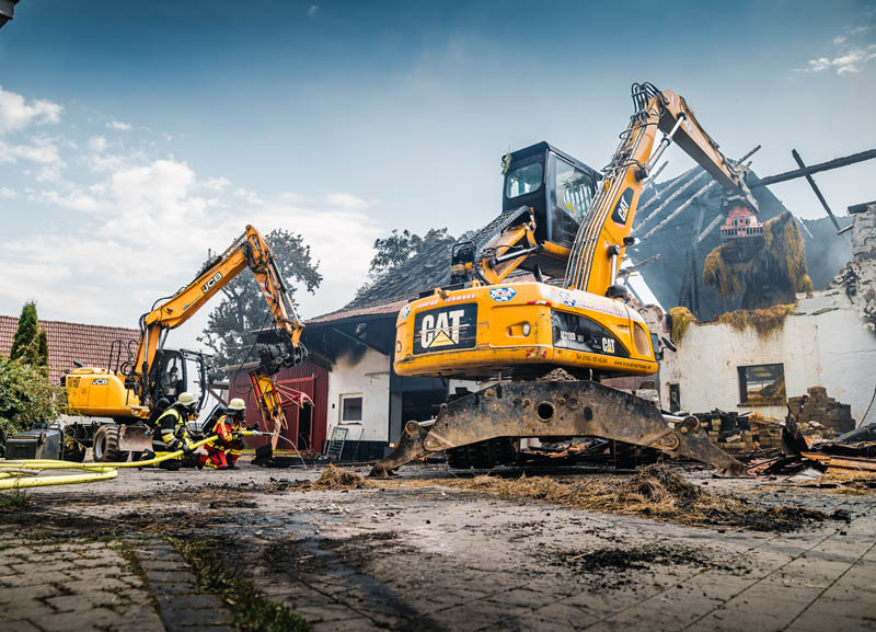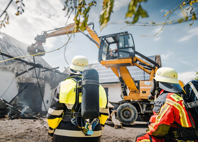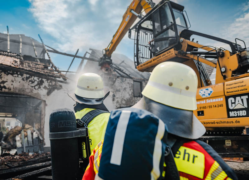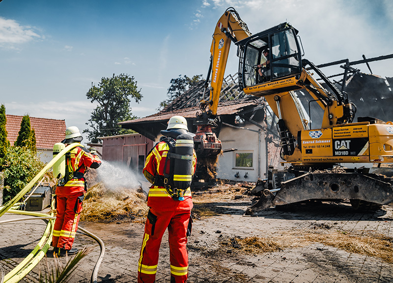 Gegen 11.30 Uhr war das Feuer unter Kontrolle und die Nachlöscharbeiten begannen. Hierfür musste das in der Scheune gelagerte Stroh ins Freie gebracht und abgelöscht werden. Aufgrund der Brandeinwirkung auf die gesamte Dachkonstruktion, drohten die Überreste des Dachstuhls und der zerstörten Photovoltaikanlage abzustürzen. Ein Arbeiten in der Scheune war daher nicht mehr gefahrlos möglich. Mit einem Bagger wurde deshalb das Dach abgetragen und das Stroh ins Freie gebracht.