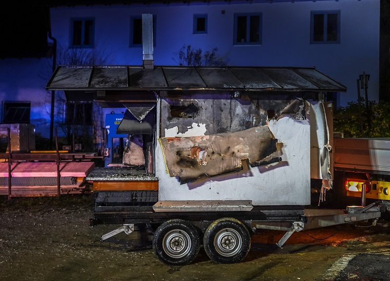 Anrufer meldeten der Integrierten Leitstelle kurz vor der Zeitumstellung einen brennenden Pizzaofen auf einem Anhänger, die Flammen drohten dabei auf ein daneben befindliches Gebäude überzugreifen.