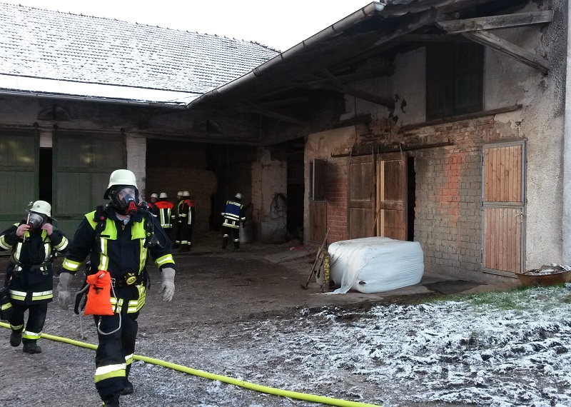 Aus noch unbekannter Ursache geriet Futterstroh in einem Stallgebäude der Landwirtschaft in Brand. Das Feuer wurde sehr früh entdeckt und konnte glücklicherweise noch in der Entstehungsphase durch die eintreffenden Feuerwehren unter Vornahme von drei Löschrohren bekämpft werden. Parallel dazu wurden 17 Jungtiere aus dem betroffenen Stallkomplex gerettet.