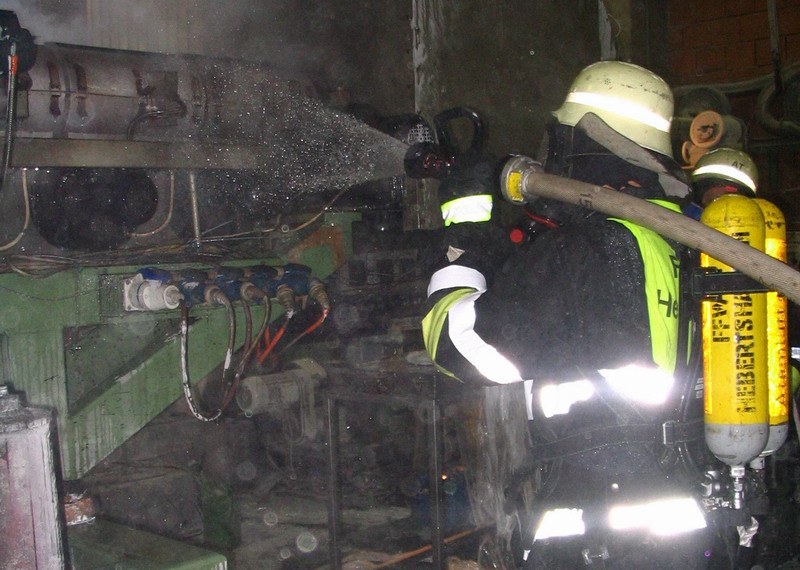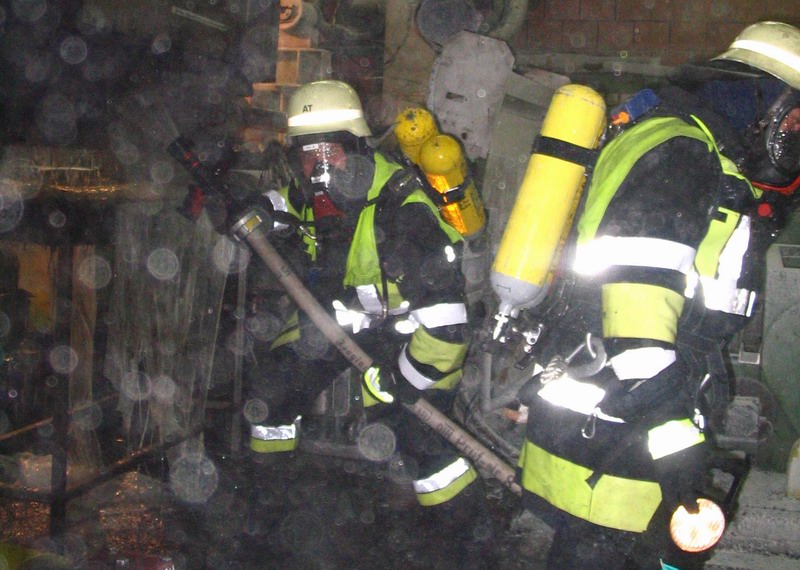 Zwei Trupps der Feuerwehr Hebertshausen gingen unter schwerem Atemschutz vor. Der erste übernahm die sofortige Brandbekämpfung, der zweite suchte die gesamte Produktionshalle nach Personen ab. Tatsächlich wurden vier Personen durch einen Hinterausgang aus der Halle gebracht und mit leichten Rauchvergiftungen dem BRK Dachau übergeben.