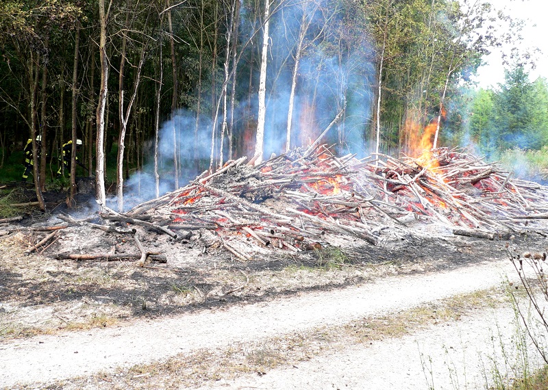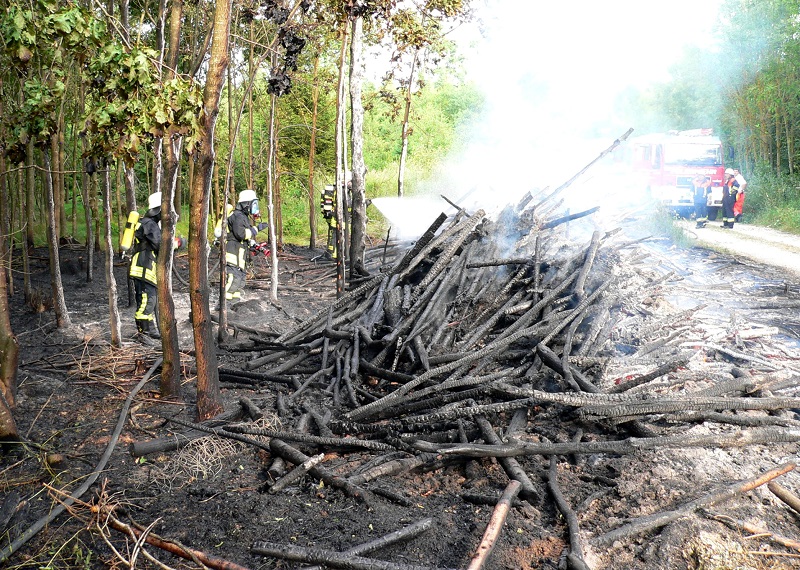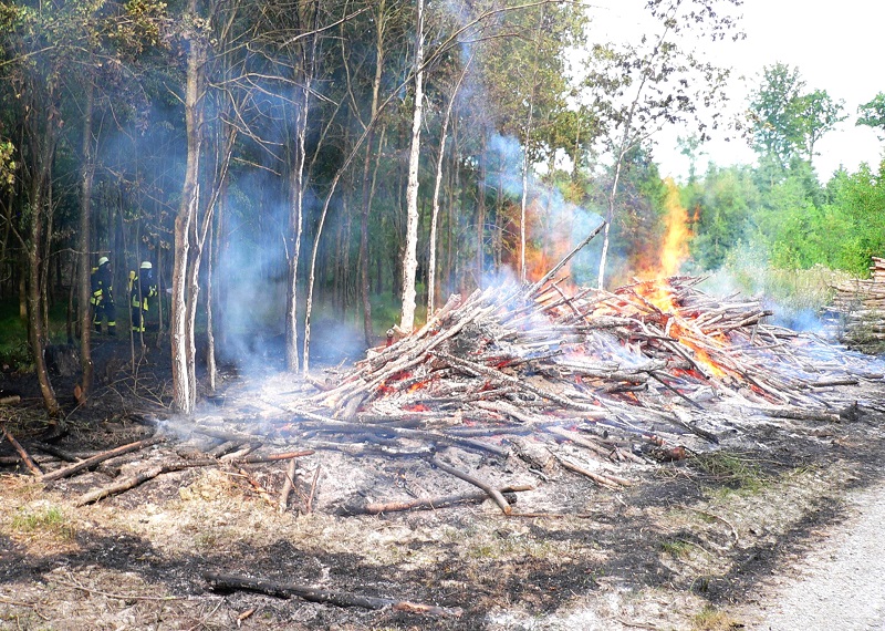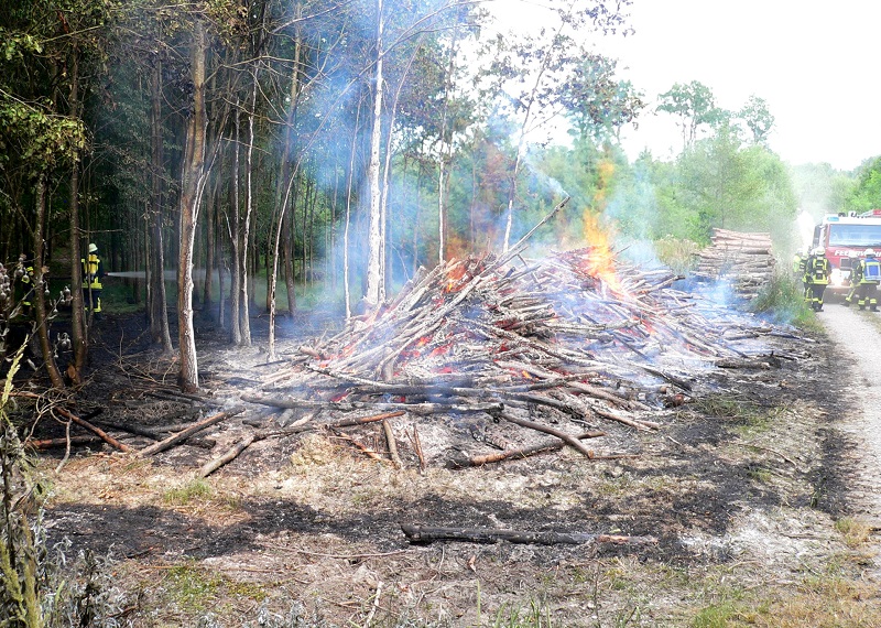 Als die Feuerwehr Lauterbach am Einsatzort eintraf, standen ein ca. 10 Kubikmeter großer Holzstapel sowie eine ca. 200 qm große Waldfläche aus bislang ungeklärter Ursache im Vollbrand.
