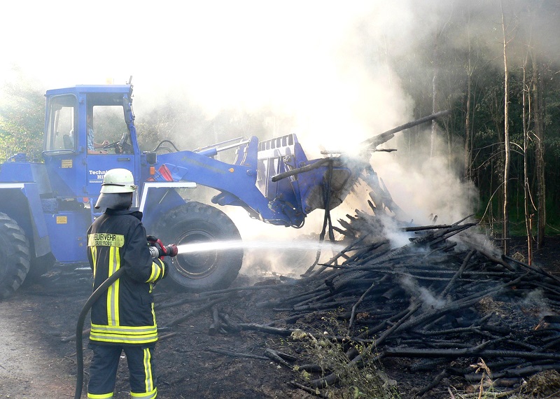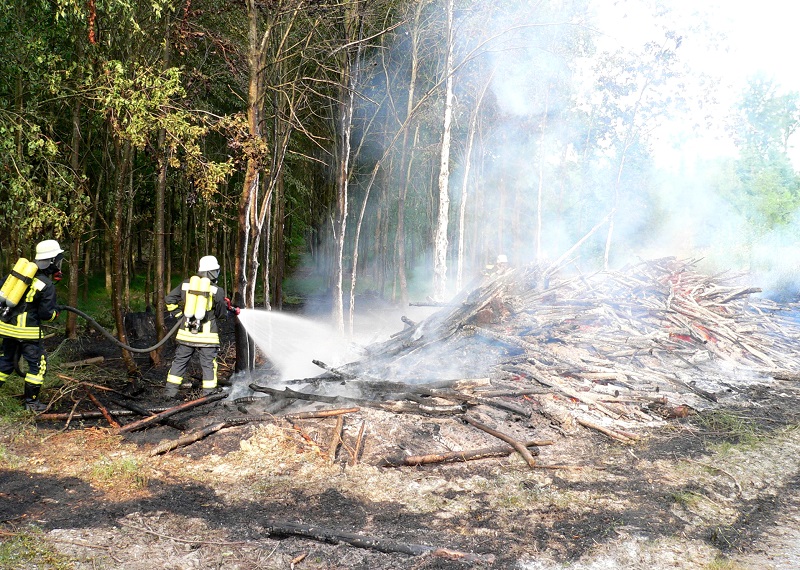 Unter schwerem Atemschutz brachte die Feuerwehr den Brand schnell unter Kontrolle und konnte eine Ausbreitung auf den angrenzenden Wald verhindern. Die nachgeforderten Kräfte des Technischen Hilfswerks unterstützten die Löscharbeiten mit einem Radlader, mit dessen Hilfe der Holzstapel abgetragen wurde. Dadurch konnten die restlichen Glutnester abgelöscht werden.
