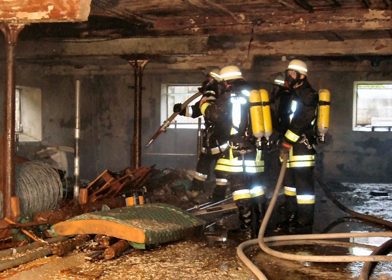 Feuerwehrmänner, mit schwerem Atemschutz ausgerüstet drangen in die Räumlichkeiten vor und setzten mehrere Rohre der Stärken C zur Bekämpfung ein.