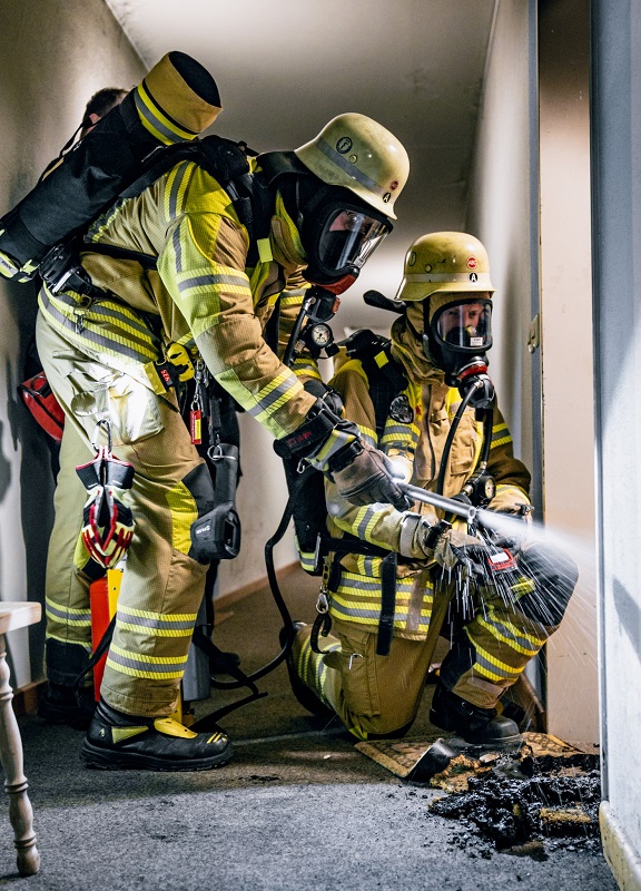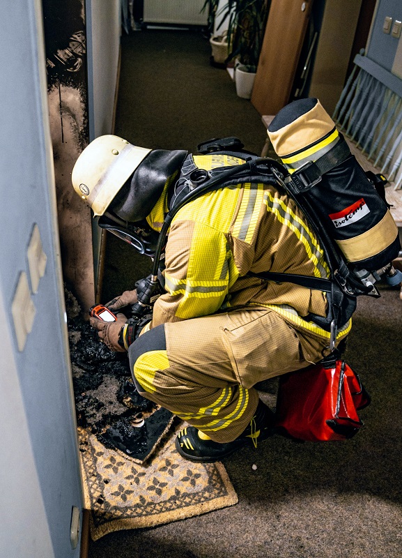 Beim Eintreffen der Feuerwehr war das Treppenhaus bereits verraucht. Ein Trupp unter schwerem Atemschutz drang umgehend in das Wohnhaus vor und löschte die Flammen in kürzester Zeit ab. Aus noch ungeklärter Ursache waren Gegenstände im Flur des Gebäudes in Brand geraten und hatten bereits auf eine Wohnungstüre übergegriffen.