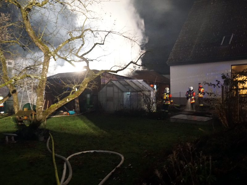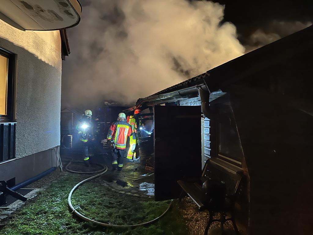 Die ersteintreffenden Feuerwehreinsatzkräfte stellten fest, dass zwei aneinandergrenzende Geräteschuppen in Brand geraten waren. Eigene Löschversuche der Eigentümer konnten nicht verhindern, dass die Schuppen beim Eintreffen der Feuerwehr bereits in Vollbrand standen. Ein Übergreifen auf das naheligende Wohngebäude konnte durch den Angriff mit drei Trupps unter Atemschutz und drei Löschrohren durch die Feuerwehr verhindert werden.