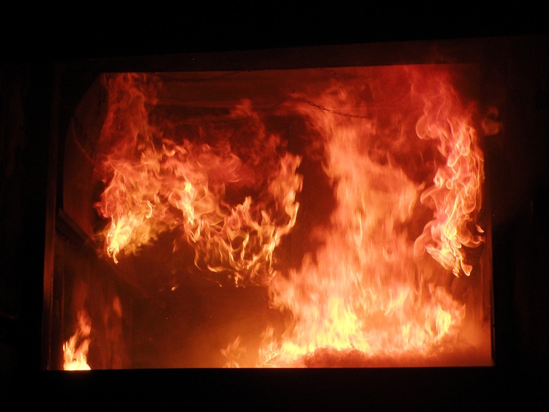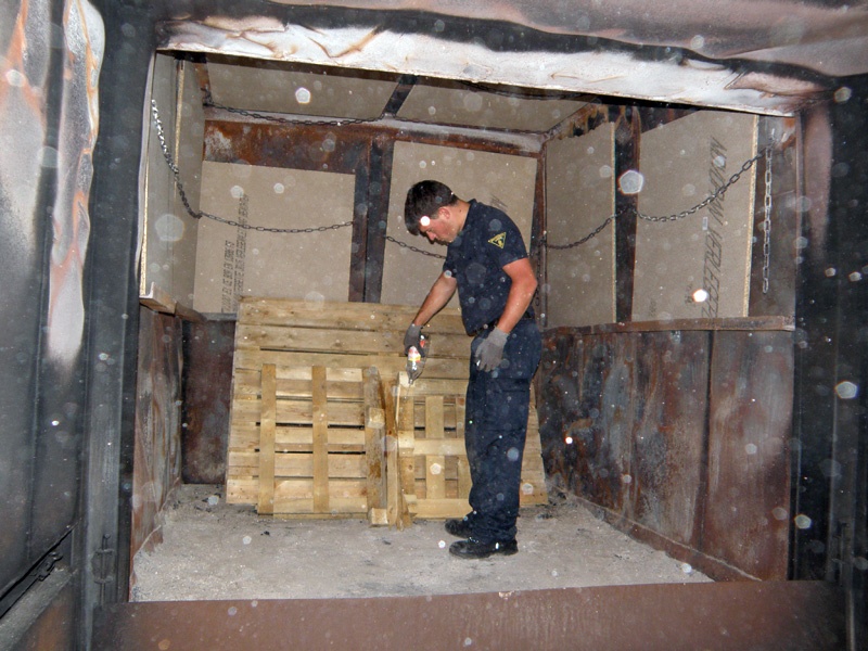 Die Feuerwehrler haben hautnah miterlebt, wie sich ein Zimmerbrand entwickelt. Die Wohnungseinrichtung wird im Container mit Spanplatten simuliert; durch die Wärmeentwicklung beginnen die Spanplatten auszugasen und bilden so die Basis für die spätere Rauchgasdurchzündung, den sogenannten flash over.