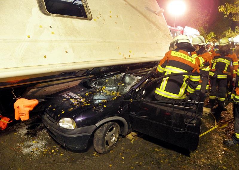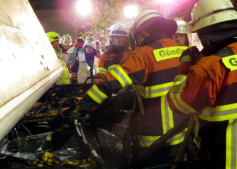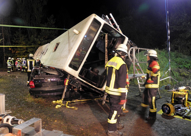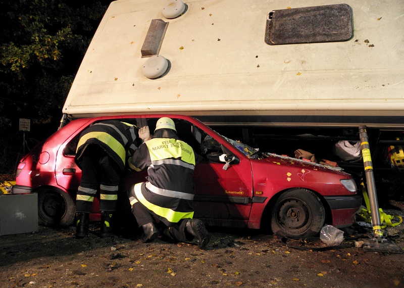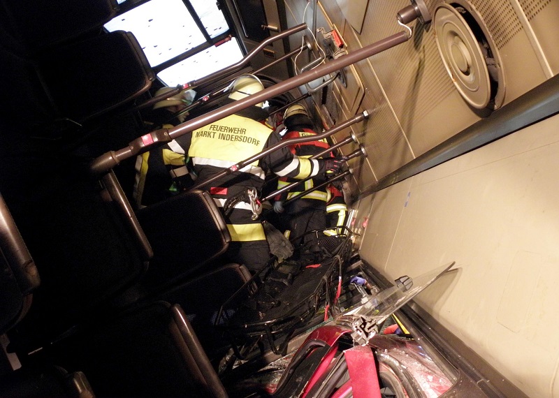 Nachdem ein gesicherter Zugang möglich war, drangen die Helfer von beiden Seiten in den verunfallten Bus vor um die Verletzen möglichst schnell und schonend aus ihrer misslichen Lage befreien zu können. Auch die beiden unter dem Bus liegenden PKW´s wurden unter Einsatz hydraulischer Rettungsgeräte geöffnet und die eingeklemmten Personen daraus befreit.