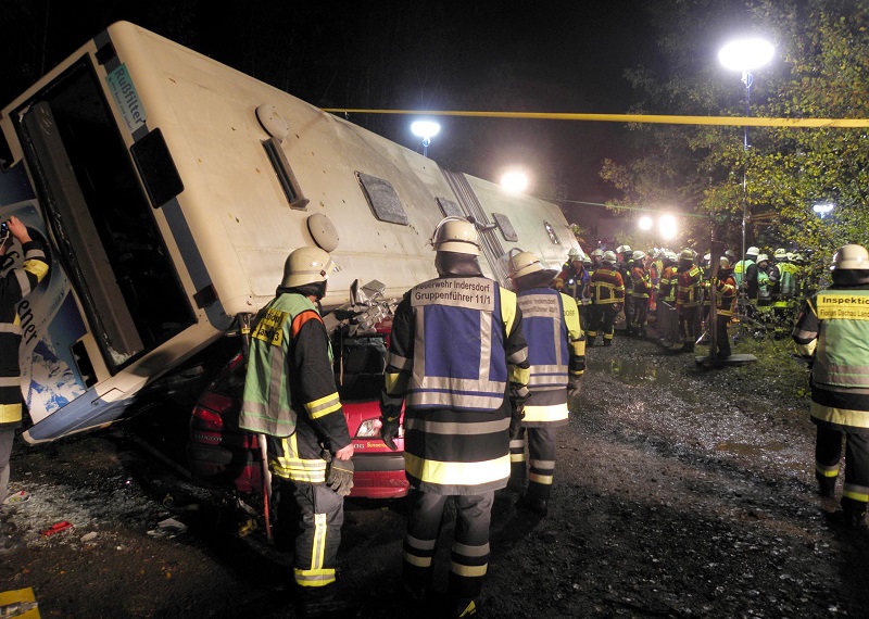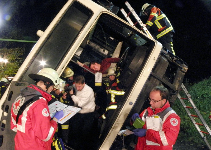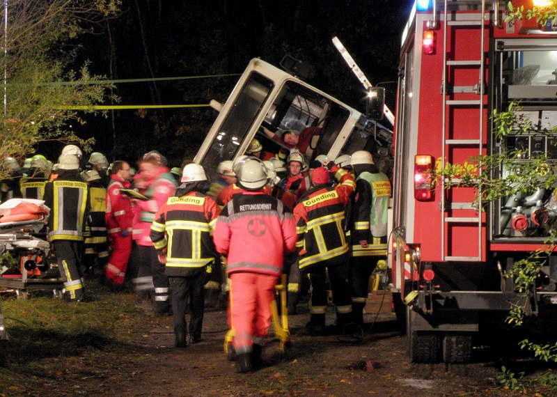 „Busunfall mit 40 Verletzten“, bei dieser Lagemeldung am vergangenen Freitag (11.10.2013) handelte es sich glücklicherweise nur um eine Übung auf dem Gelände der Bereitschaftspolizei Dachau. Bei dem angenommenen Szenario kippte ein Linienbus um und stürzte auf zwei PKW mit Insassen.