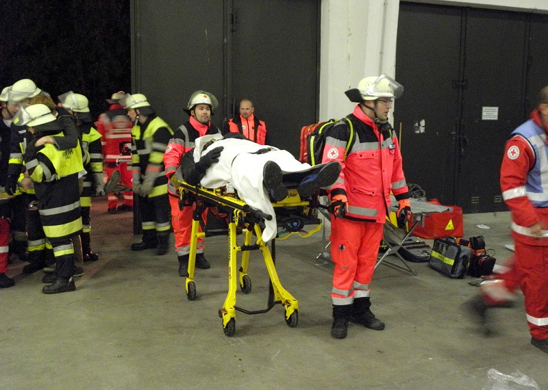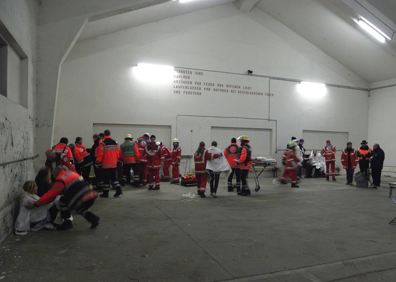Den ersten Rettungskräften liefen bereits unter Schock stehende Verletzte entgegen, die sich noch selbst befreien konnten und betreut werden mussten. Der Rettungsdienst bereitete für die Verletztenversorgung eine nahe gelegene Halle entsprechend vor, von dieser dann der Abtransport geregelt wurde. Dabei spielten sich realitätsnahe Szenen ab, die nicht nur auf die verplüffend echt wirkende Schminke der Mimen zurückzuführen war, sondern auch auf deren schauspielerische Leistungen.