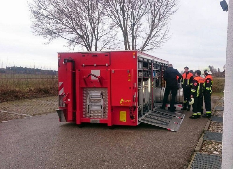 In diesem Rahmen wurde auch der AB-Gefahrgut des Landkreises von der Feuerwehr Dachau geholt, dessen Gerätschaften zusammen mit dem zuständigen Kreisbrandmeister-Gefahrgut erkundet wurden.