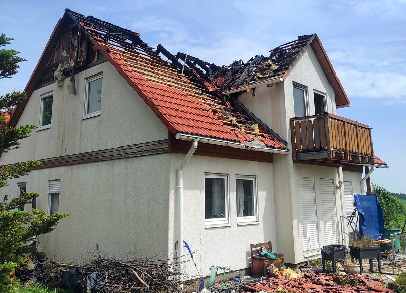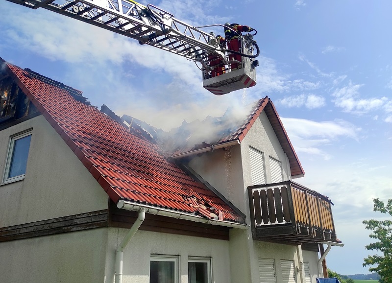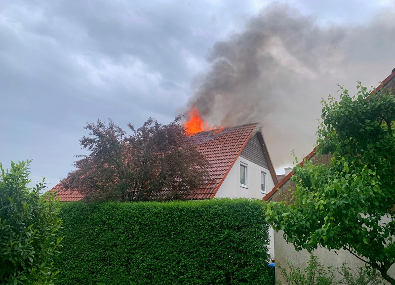 Zu einem Brand in Pipinsried alarmierte die Integrierte Leitstelle am Montagmorgen (23.05.2022) um 9.05 Uhr ein Großaufgebot von Feuerwehr und Rettungsdienst. Nach einem Blitzeinschlag während eines Gewitters fing der Dachstuhl eines Einfamilienhauses Feuer.