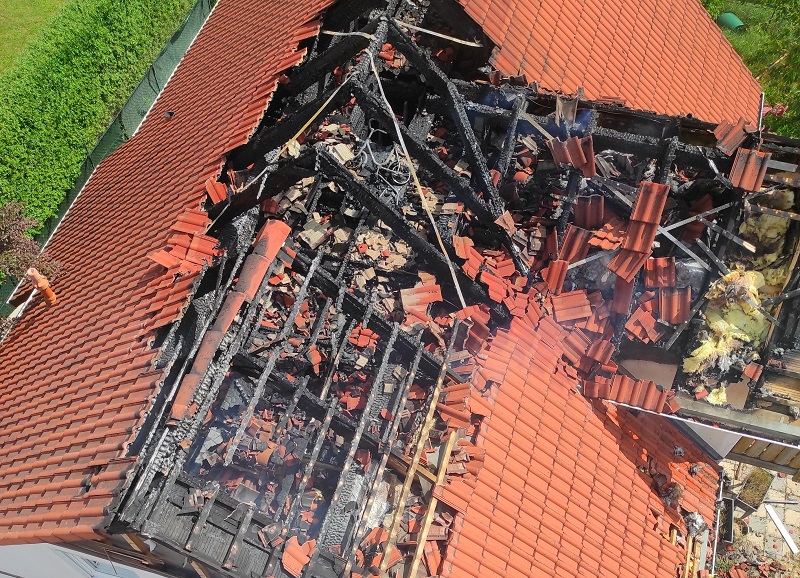 Im Anschluss begannen die Nachlöscharbeiten, die über 2 Stunden andauern sollten. Dabei wurde die Dachhaut des Wohnhauses mittels Einreißhaken geöffnet, so dass versteckte Glutnester lokalisiert und abgelöscht werden konnten. Unterstützt wurden die Tätigkeiten mit der Wärmebildkamera.