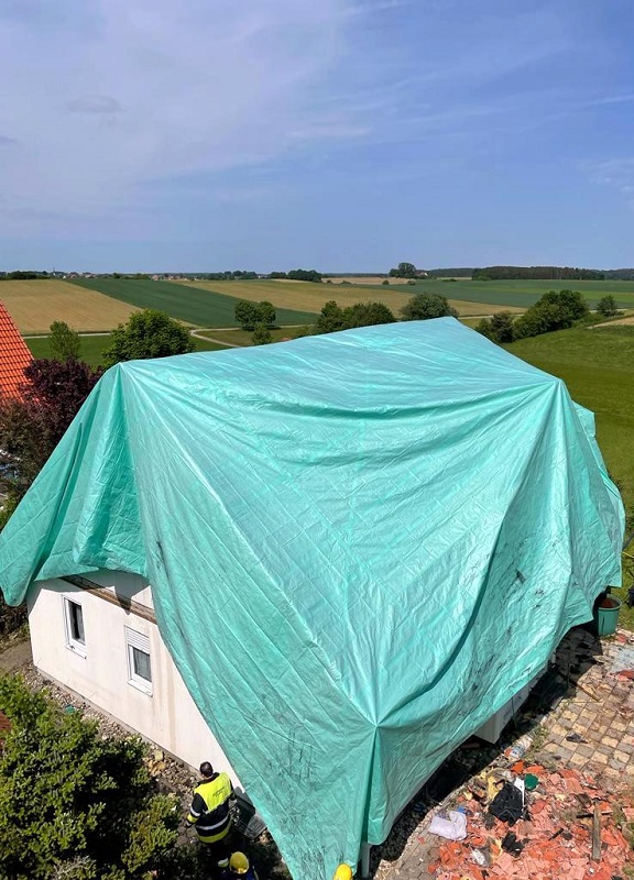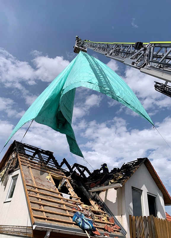 Ein Teil der Einrichtung im Dachgeschoss wurde dabei durch eine große Dachhautöffnung ins Freie befördert, anschließend wurde mit Hilfe der Drehleiter ein sogenanntes „Notdach“ über das Haus gezogen, welches das offene Dach vor Witterungseinflüssen schützt.