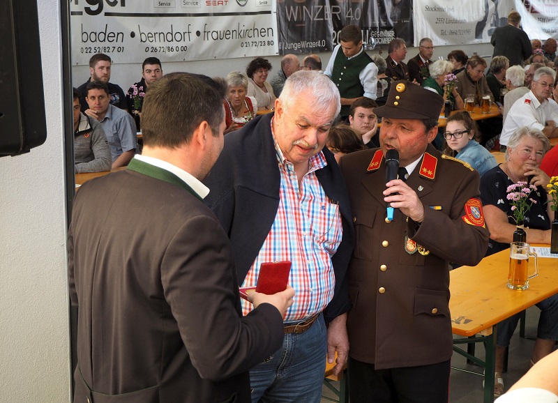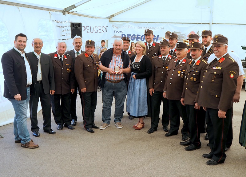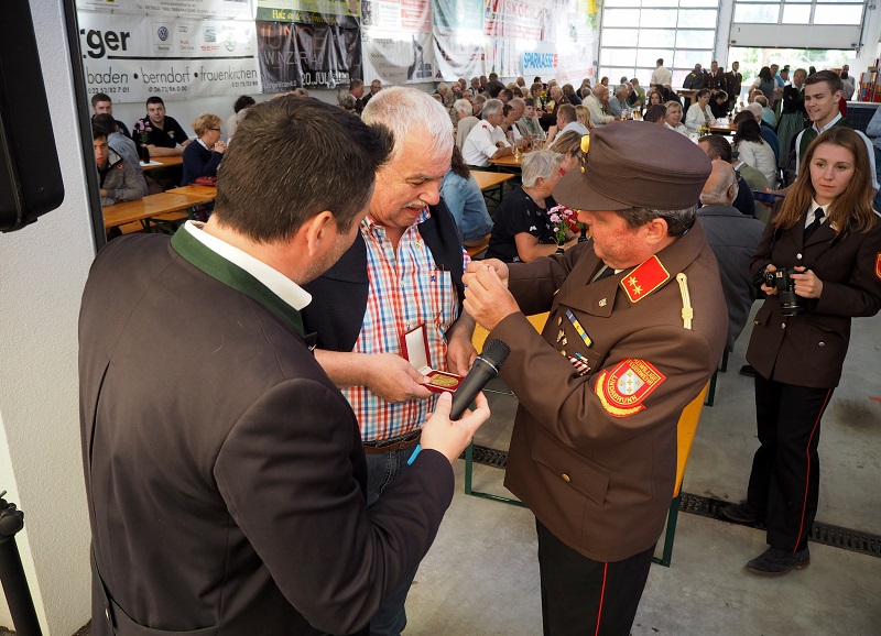 Eine besondere Ehre wurde dem Dachauer Ehrenkreisbrandrat Rudi Reimoser beim Abschied am Sonntag zu teil. Für seine jahrzehntelange Pflege der Feuerwehrpartnerschaft sowie Freundschaft zur Gemeinde Enzesfeld-Lindabrunn, erhielt er aus den Händen von Bürgermeister Franz Schneider die goldene Ehrennadel der Marktgemeinde verliehen. Er ist damit der erste Nichtbürger, der diese ehrenvolle Auszeichnung erhält.