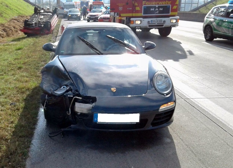 Der Lenker eines Peugeot wollte zwischen den Anschlussstellen Sulzemoos und Odelzhausen einen vorausfahrenden VW Polo überholen, übersah jedoch beim Ausscheren einen Porsche auf der linken Fahrspur. Beim Zusammenprall hat der Porsche den Peugeot schließlich auf den VW Polo geschoben, der sich infolge überschlagen hat und neben der Fahrbahn auf dem Dach zum Liegen kam.